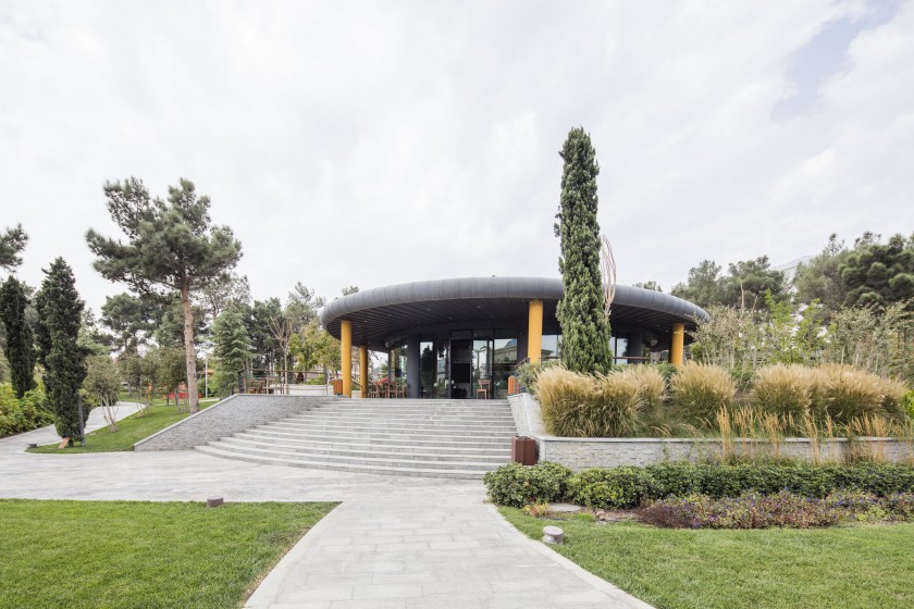 The structure of a circular form with a 175 meter square floor area, providing services in the ‘Public Park Dedicated to the Memory of Haydar Aliyev’ of a 4,5 hectare surface area provides a terrace space of approximately 350 meters square to its users.