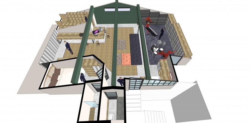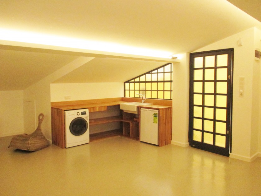 This is a project where the abandoned attic of an old building structure in Galata, which is one of the districts that bear the historical texture of Istanbul and is rapidly becoming one of the most preferable districts of Istanbul, was turned into a one person living space. It was ensured that the columns falling on the ground were removed by supporting the wooden main joists of the ceiling with iron joists in order to create a spacious living and working space to the extent allowed by the horizontal ratios in the middle volume. The bedroom, bathroom and storage space volumes were located at the corner spots where the ceiling height was lower.